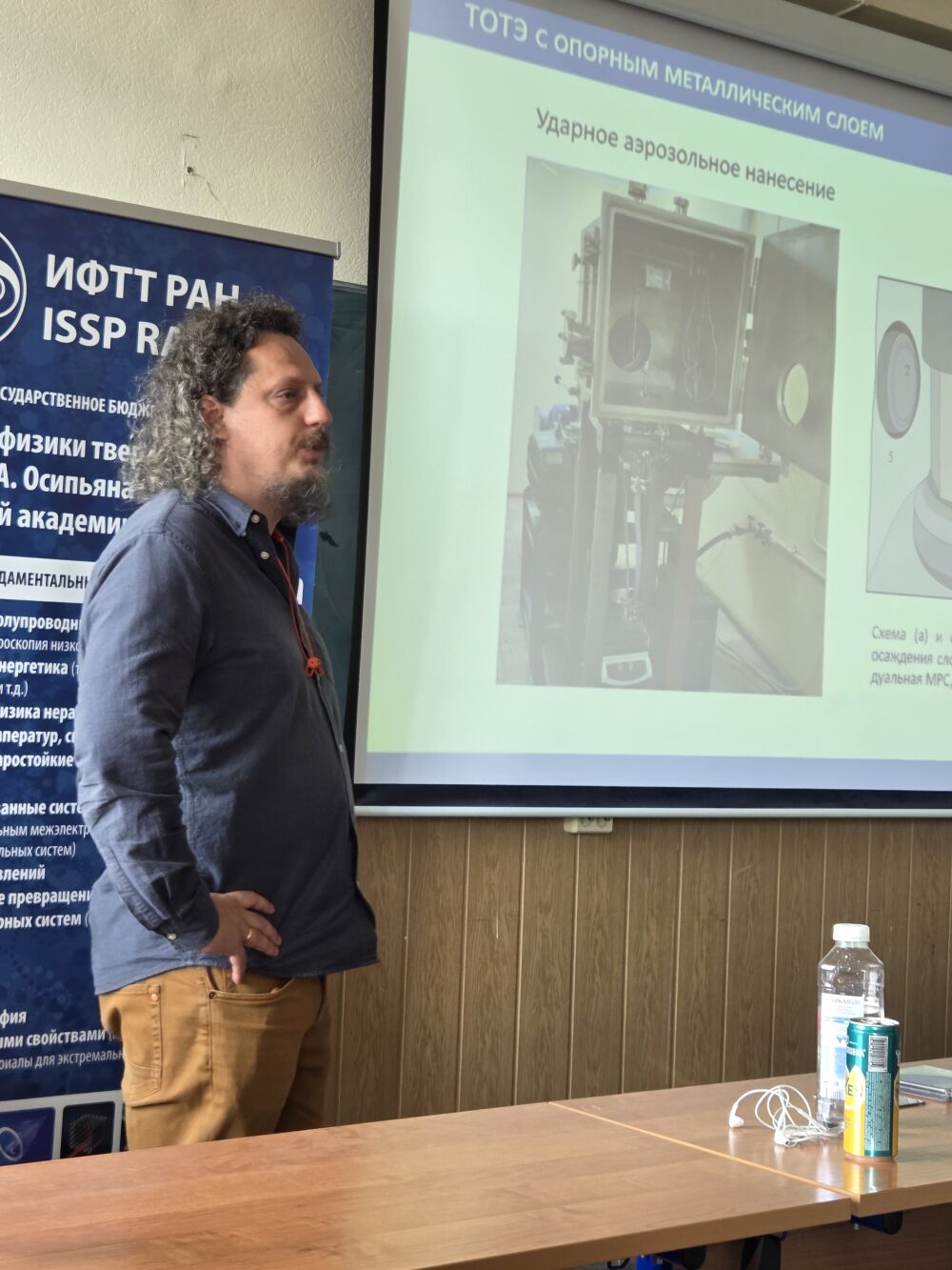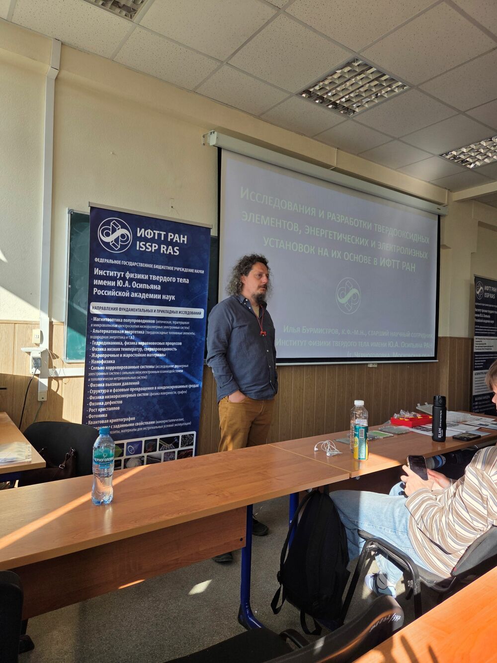 Встреча началась с выступления заместителя заведующего базовой кафедрой «Физика конденсированных сред» н.с. Лаборатории материаловедения ИФТТ РАН к.т.н. Строгановой Т.С. В своем докладе Татьяна Сергеевна рассказала об истории формирования института, его структурных подразделениях и перспективных направлениях исследований, уделив особое внимание работе базовой кафедры ФКС НИУ ВШЭ. Программу встречи продолжила презентация с.н.с. Лаборатории спектроскопии дефектных структур ИФТТ РАН к.ф.-м.н. Бурмистрова И.Н. «Исследования и разработки твердооксидных элементов, энергетических и электролизных установок на их основе». Илья Николаевич представил широкий спектр научных и технологических задач по направлению «Альтернативная и водородная энергетика», которые успешно решаются сотрудниками ИФТТ РАН, при этом он акцентировал внимание на магистерскую программу ФКС НИУ ВШЭ «Водородная энергетика».