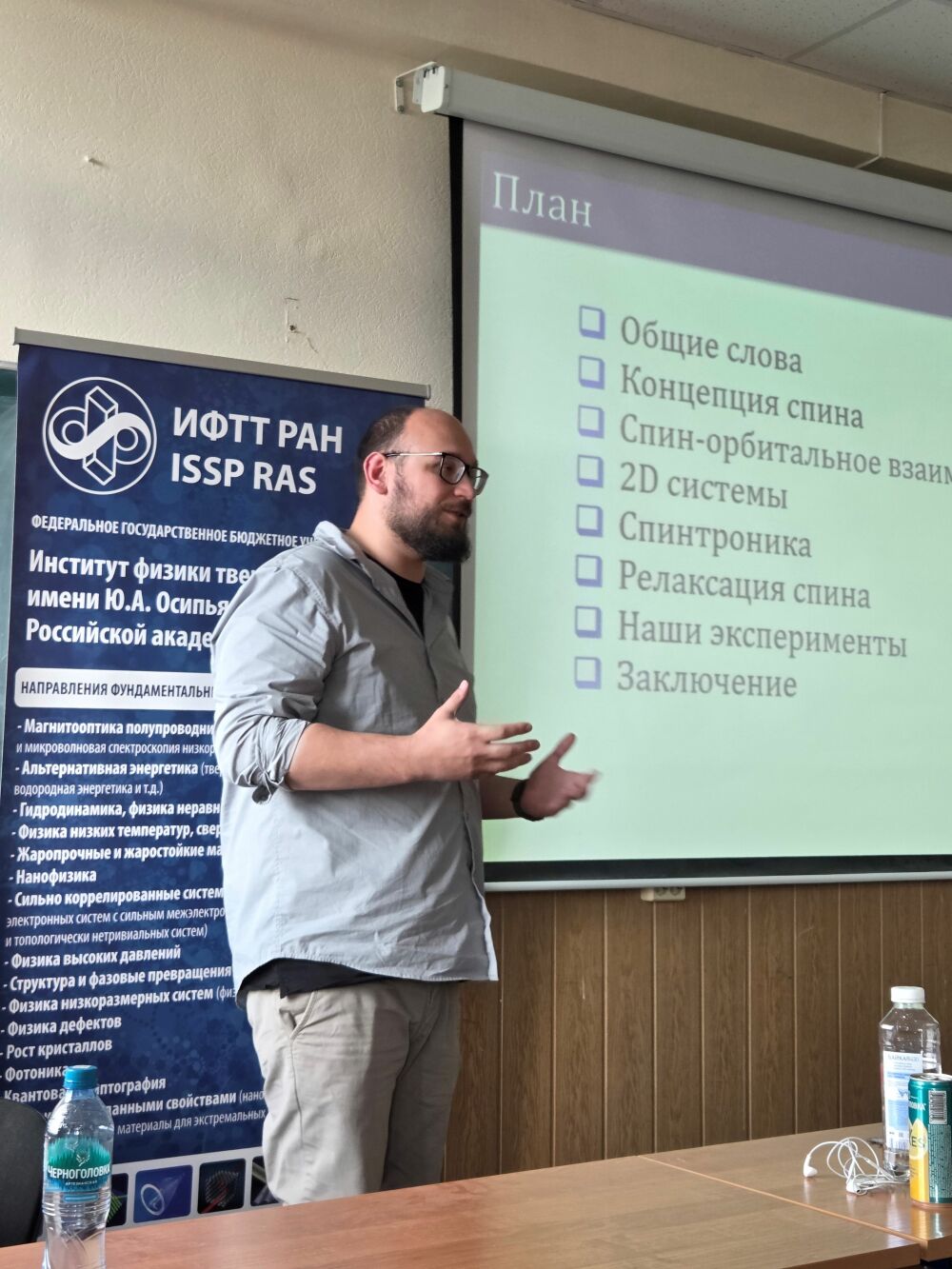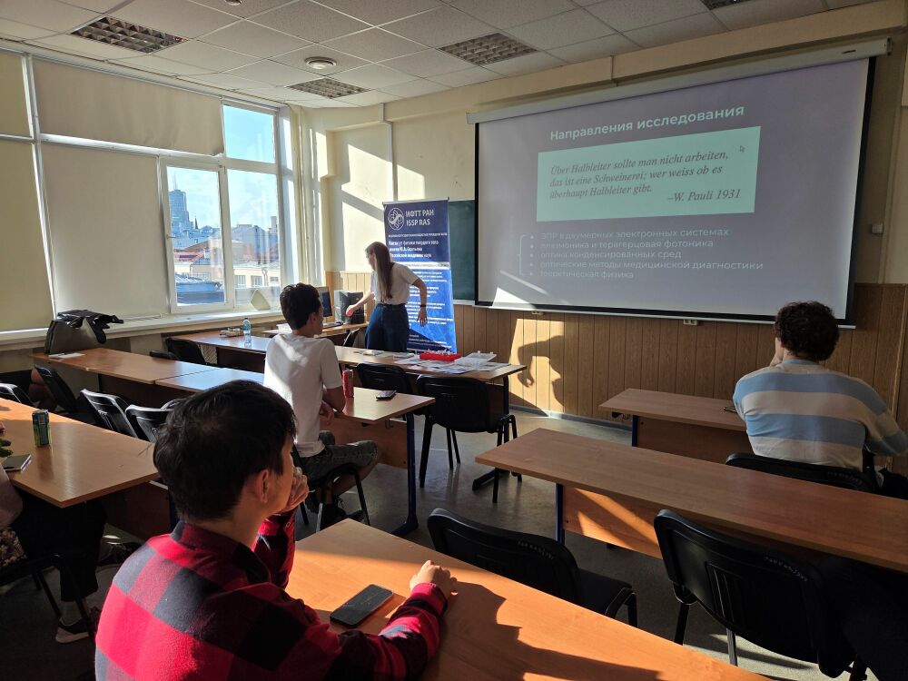 С.н.с. Лаборатории неравновесных электронных процессов ИФТТ РАН, доцент базовой кафедры ФКС НИУ ВШЭ к.ф.-м.н. Щепетильников А.В. сообщил о направлении научных работ лаборатории. Антон Вячеславович увлекательно рассказал о спинтронике и квантовом эффекте Холла, двумерных структурах и эксперименте Штерна–Герлаха. Своим впечатлением от учебы на кафедре и работе поделилась аспирант кафедры ФКС НИУ ВШЭ Андреева Софья Алексеевна, которая также является м.н.с. Лаборатории неравновесных электронных процессов ИФТТ. Софья рассказала о современном научном оборудовании, позволяющим проводить все этапы исследования в стенах ИФТТ РАН: от постановки задачи и создания образца до публикации статьи. Кроме этого, Софья подчеркнула широкий спектр научных задач, изучаемых в институте.