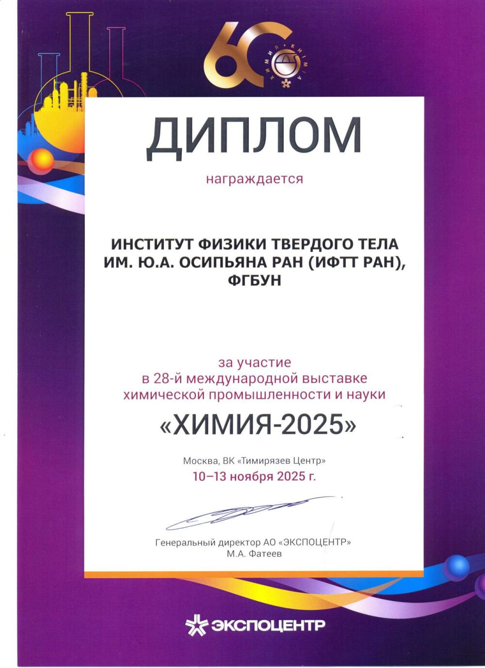 Состоялась торжественная церемония награждения участников и партнеров юбилейной выставки «Химия-2025». Представителям компаний были вручены почетные дипломы в знак признания их вклада в развитие химической отрасли и многолетнего участия в выставке. Среди награжденных – ИФТТ РАН, удостоенный Диплома выставки за участие. Также Дипломом выставки как инновационная разработка отмечена работа сотрудников Института А.А. Авакянц, В.Д. Есина, Д.Ю. Казьмина, Н.Н. Орловой, А.Н. Тимониной, Н.Н. Колесникова, Э.В. Девятова «Спиновый вентиль на основе GeTe». Как перспективная разработка Дипломом выставки отмечена работа сотрудников ИФТТ РАН А.У. Шарафутдинова, Е.В. Ципис, Д.В. Матвеева, Н.В. Деменевой, М.С. Дякиной, С.Д. Родионовой, В.В. Хартона, С.И. Бредихина «Утилизация сбросных газов в ТОТЭ: влияние соотношения CH4/CO2/H2».