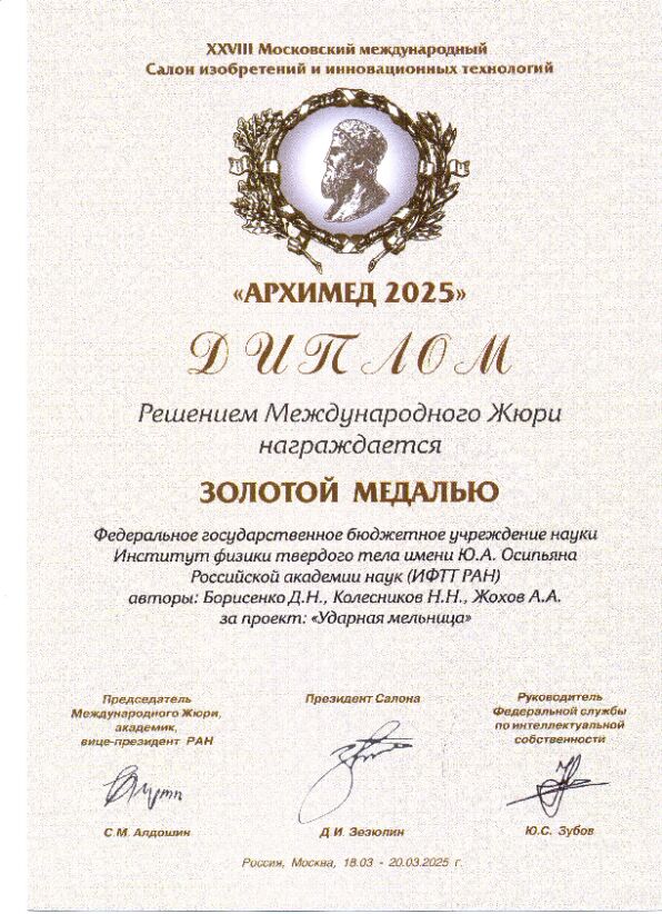 - Диплом и Золотая Медаль ИФТТ РАН за проект «Ударная мельница» на XXVIII Московском международном Салоне изобретений и инновационных технологий «Архимед-2025». (18.03.2025г. – 20.03.2025г.)