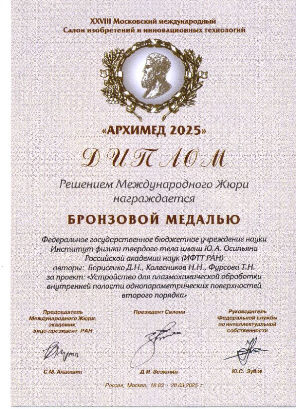 - Диплом и Бронзовая Медаль ИФТТ РАН за проект «Устройство для плазмохимической обработки внутренней полости однопараметрических поверхностей второго порядка» на XXVIII Московском международном Салоне изобретений и инновационных технологий «Архимед-2025». (18.03.2025г. – 20.03.2025г.)