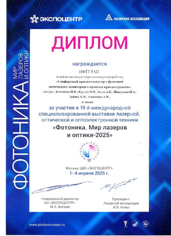 - Диплом ИФТТ РАН за представленную перспективную разработку» «Сапфировый криоаппликатор с функцией оптического мониторинга процесса криодеструкции», а также за участие в 19-ой Международной специализированной выставке лазерной, оптической и оптоэлектронной техники «Фотоника. Мир лазеров и оптики-2025» (01.04.2025г. – 04.04.2025г.)