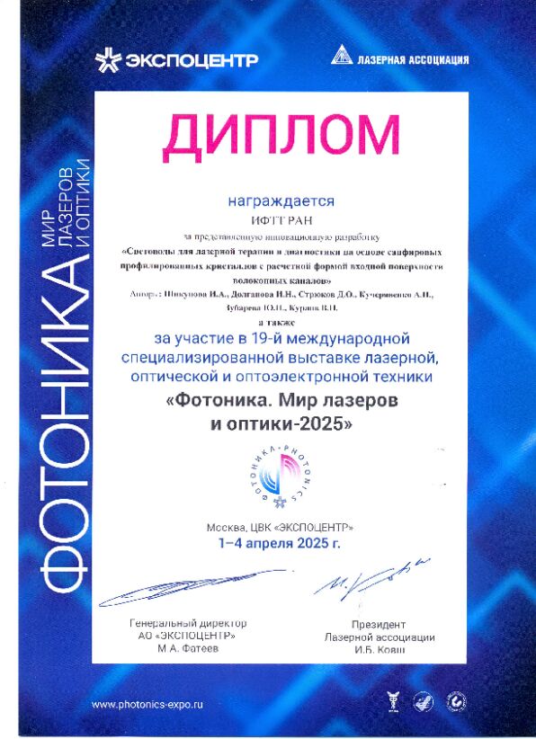 - Диплом ИФТТ РАН за представленную инновационную разботку «Световоды для лазерной терапии и диагностики на основе сапфировых профилированных кристаллов с расчетной формой входной поверхности волоконных каналов», а также за участие в 19-ой Международной специализированной выставке лазерной, оптической и оптоэлектронной техники «Фотоника. Мир лазеров и оптики-2025» (01.04.2025г. – 04.04.2025г.)