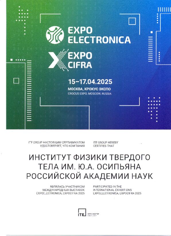 - Сертификат удостоверяет, что ИФТТ РАН являлся участником выставки «Экспоэлектроника-2025» на 27-ой Международной выставке электроники: компоненты и технологии, материалы и оборудование, встраиваемые системы и конечные решения «Экспоэлектроника-2025» (15.04.2025г. – 17.04.2025г.)