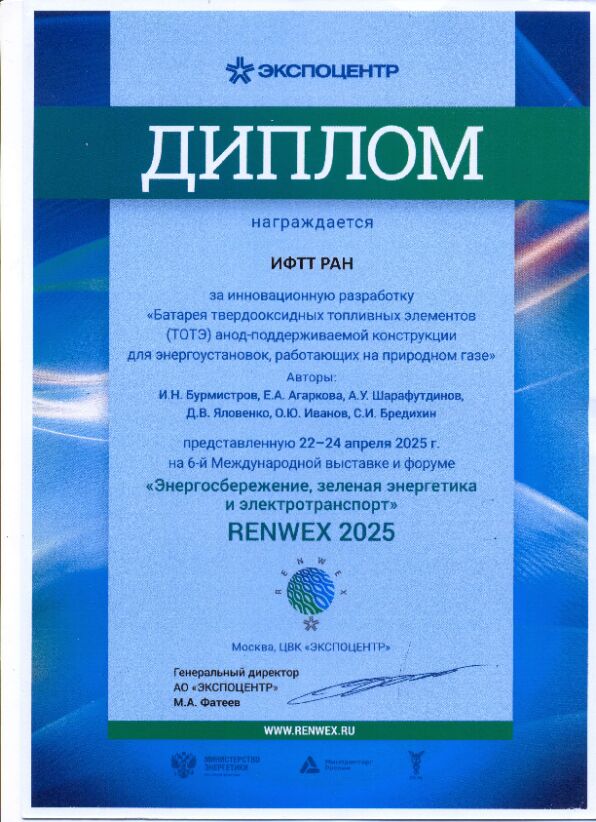 - Диплом ИФТТ РАН за инновационную разработку «Батарея твердооксидных топливных элементов (ТОТЭ) анод-поддерживаемой конструкции для энергоустановок, работающих на природном газе», представленную с 22 по 24 апреля 2025 года на 6-й Международной выставке и форум «Энергосбережение, зеленая энергетика и электротранспорт» RENWEX 2025.