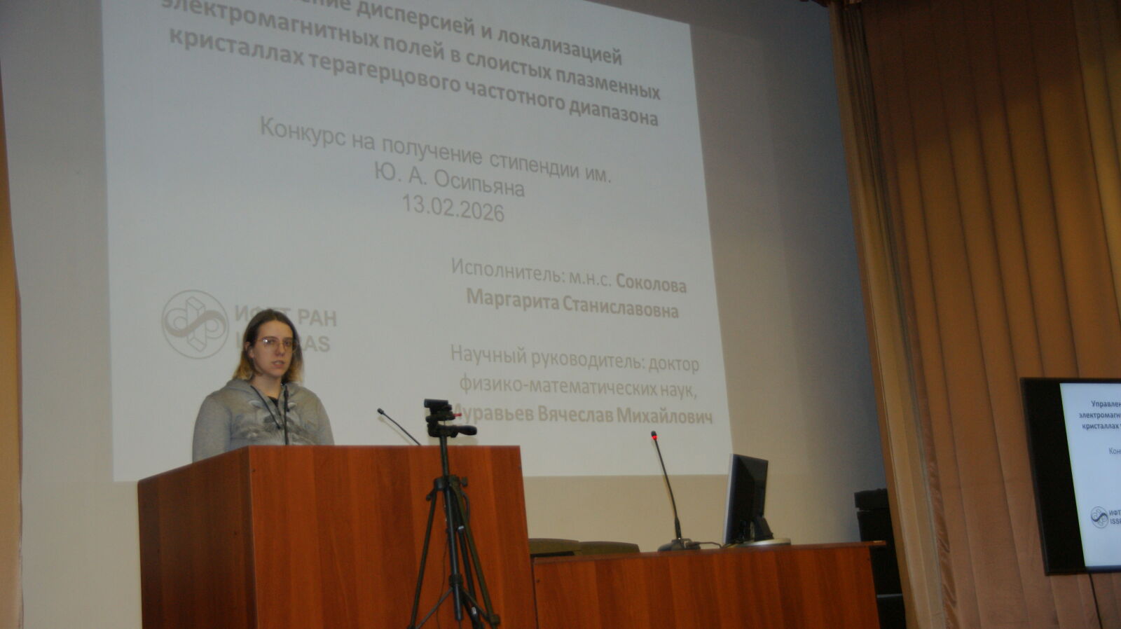 Победителями конкурса 2026 года стали: Джикирба Кирилл Романович, представивший работу «Исследование плазменных возбуждений в тонких сверхпроводящих пленках»; Никонов Владислав Дмитриевич – за работу «Исследование процесса электрохимического осаждения оксидных покрытий» и Соколова Маргарита Станиславовна – за работу «Управление дисперсией и локализацией электромагнитных полей в слоистых плазменных кристаллах терагерцового частотного диапазона».