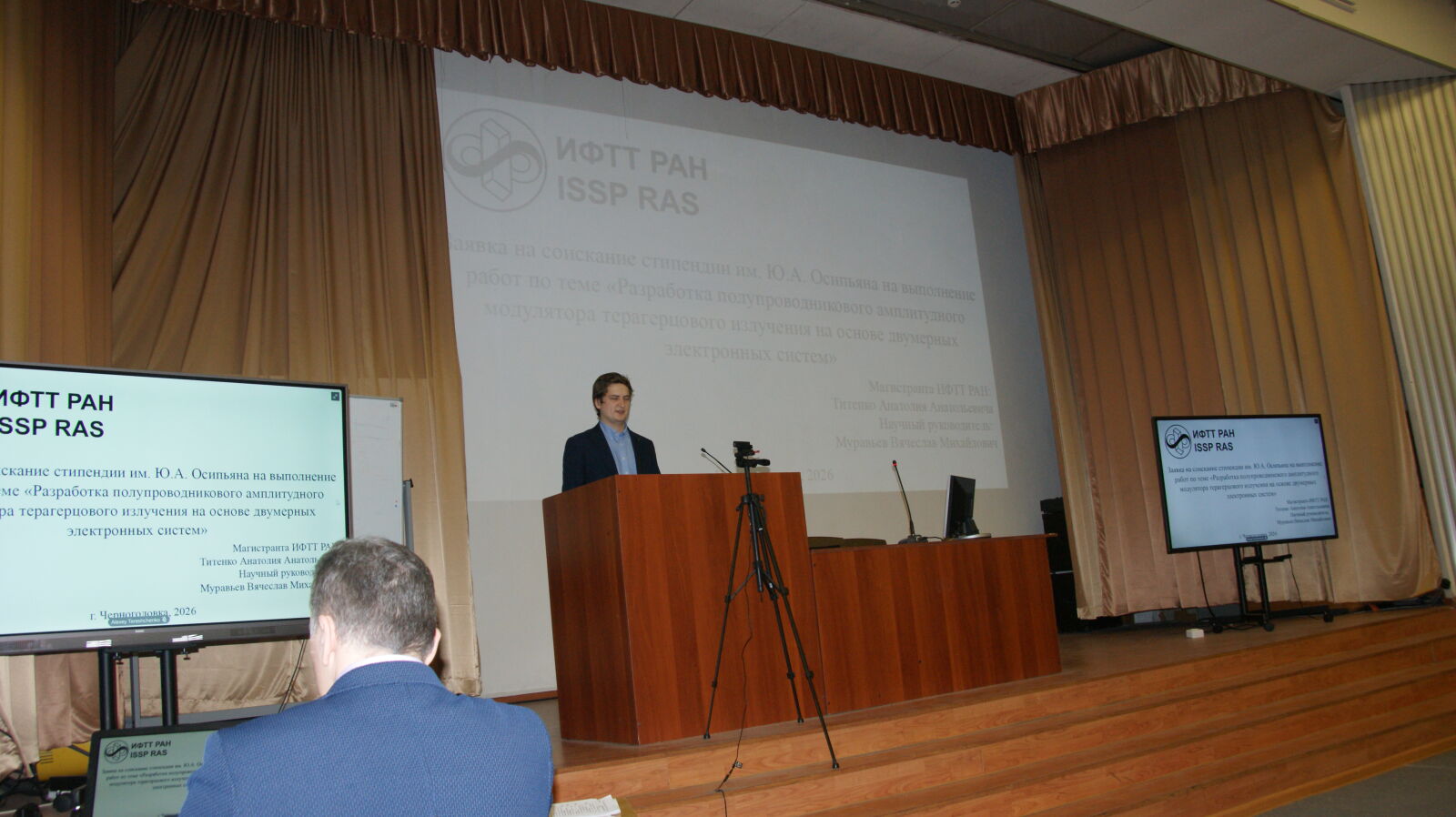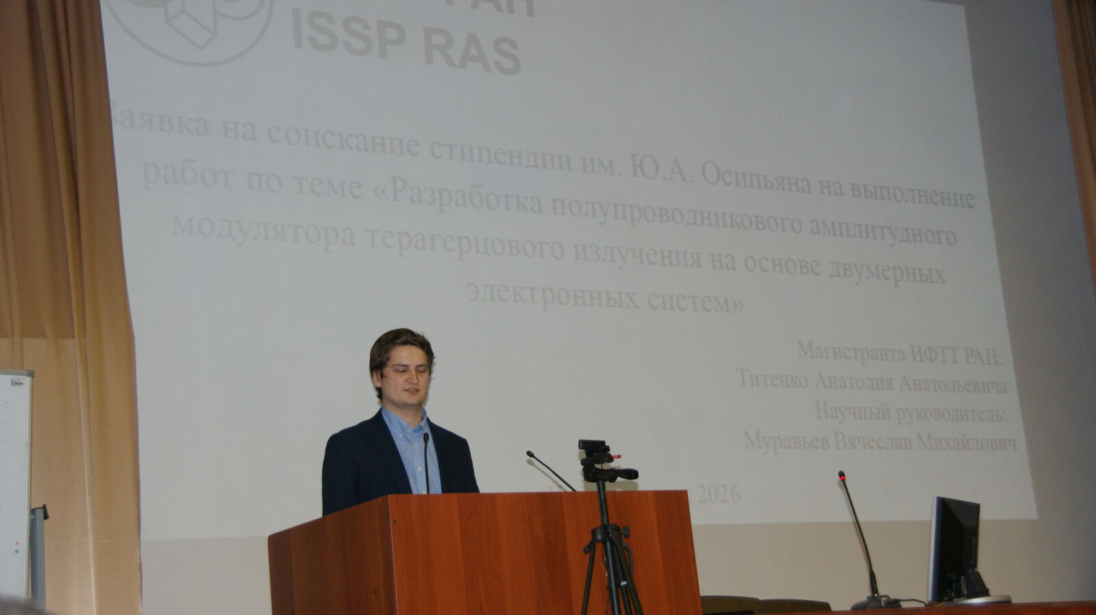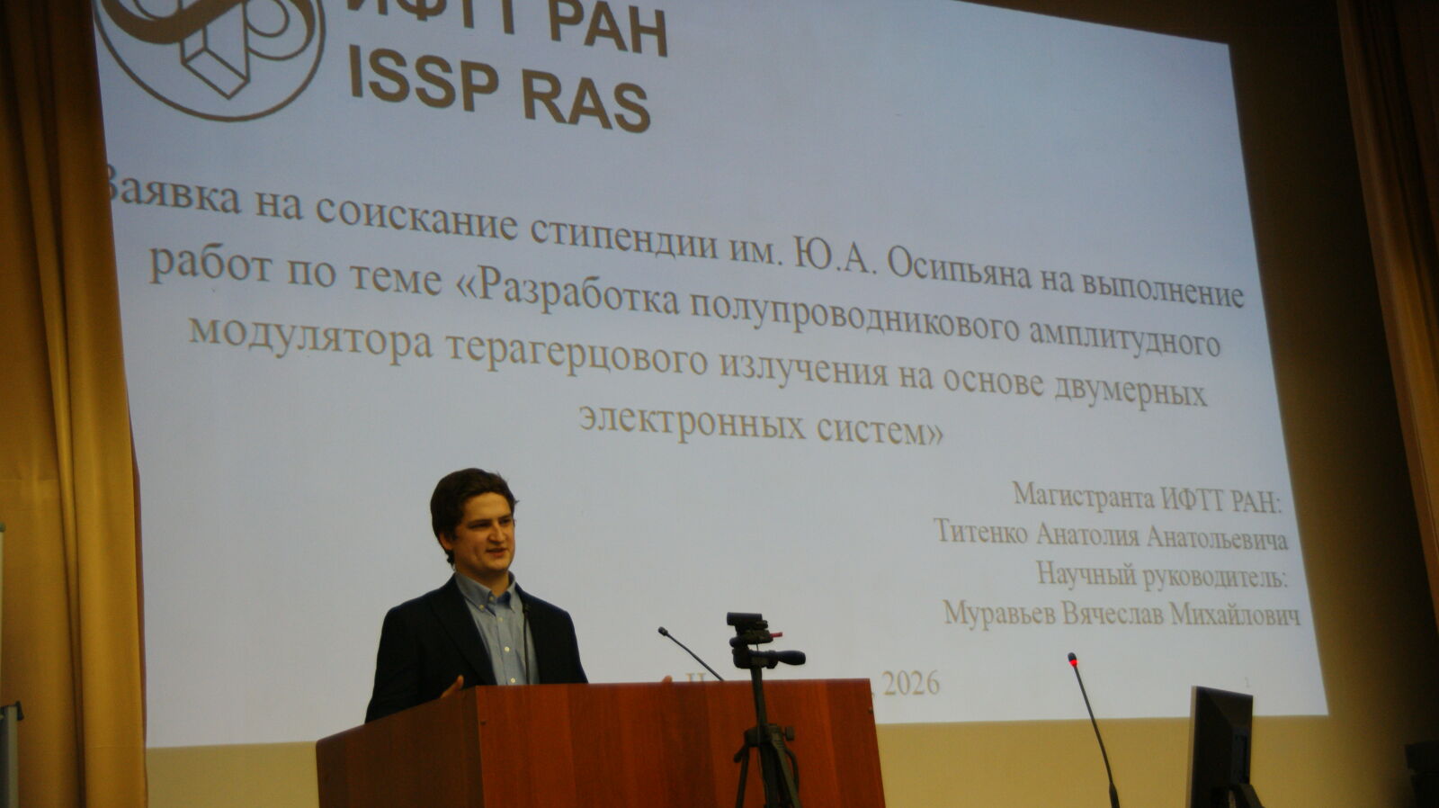13-го февраля 2025 года в ИФТТ РАН состоялся XVI конкурс на соискание стипендии им. Ю.А. Осипьяна. Стипендия имени Ю.А. Осипьяна была учреждена Ученым советом ИФТТ РАН в 2011 году в честь 80-летия со дня рождения академика Ю.А. Осипьяна, внесшего большой вклад в образование и становление Института. Стипендия присуждается по результатам конкурса научных работ среди молодых ученых ИФТТ РАН. Конкурс проводится ежегодно в преддверии дня создания ИФТТ РАН – 15 февраля. Конкурсная комиссия, включающая представителей дирекции Института, членов Российской академии наук, ведущих ученых и Председателя Совета молодых ученых, оценивает научные работы молодых ученых. Решение комиссии утверждает Ученый совет Института. В начале заседания конкурсная комиссия заслушивает доклады о достигнутых результатах стипендиатов предыдущего года. После одобрения отчетов, члены комиссии рассматривают научные работы молодых ученых, представленные на соискание стипендии им. Ю.А. Осипьяна. В 2026 году на конкурс молодыми учеными ИФТТ РАН было представлено 13 работ, что почти в два раза превышает число работ, участвовавших в конкурсе в 2025 году.