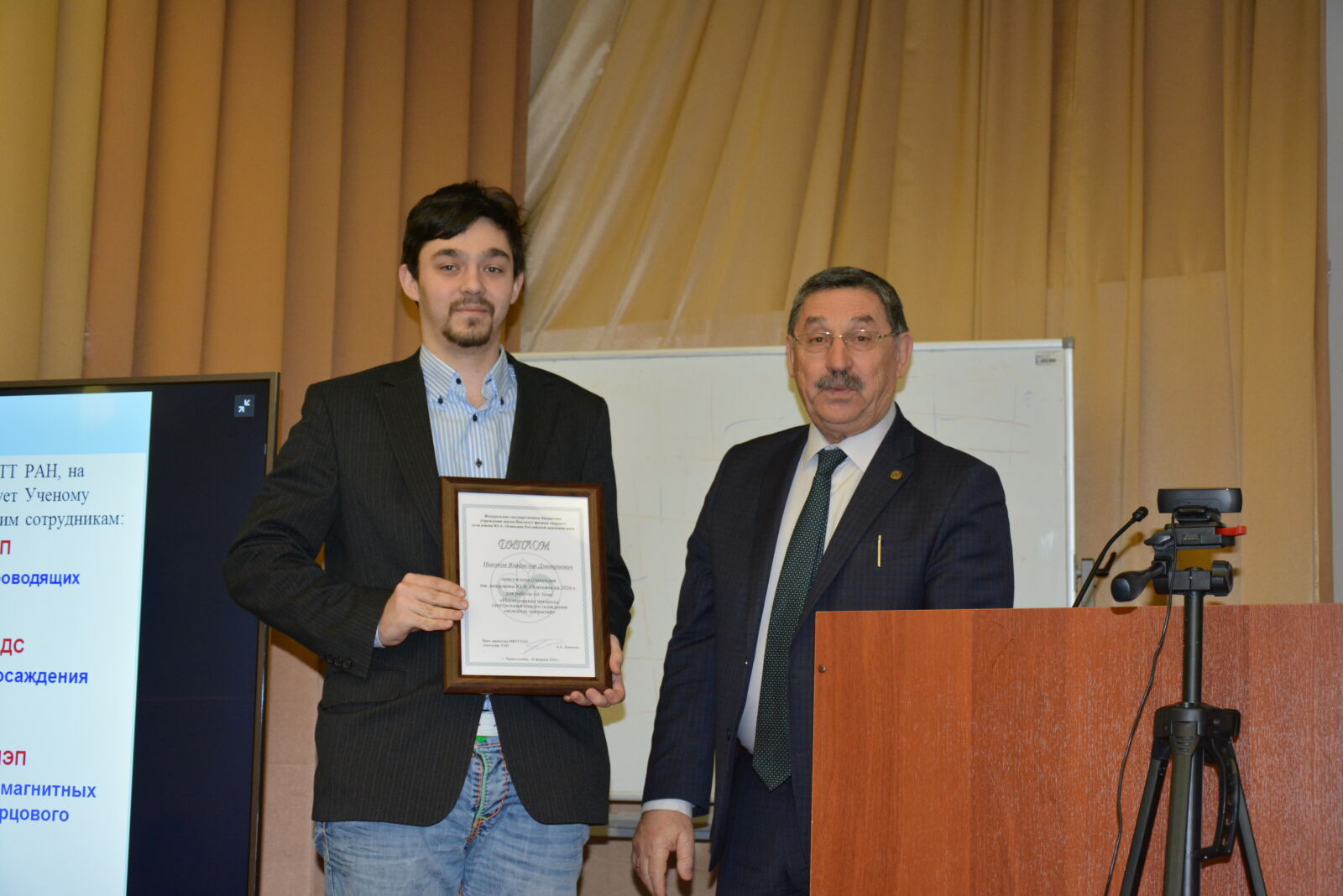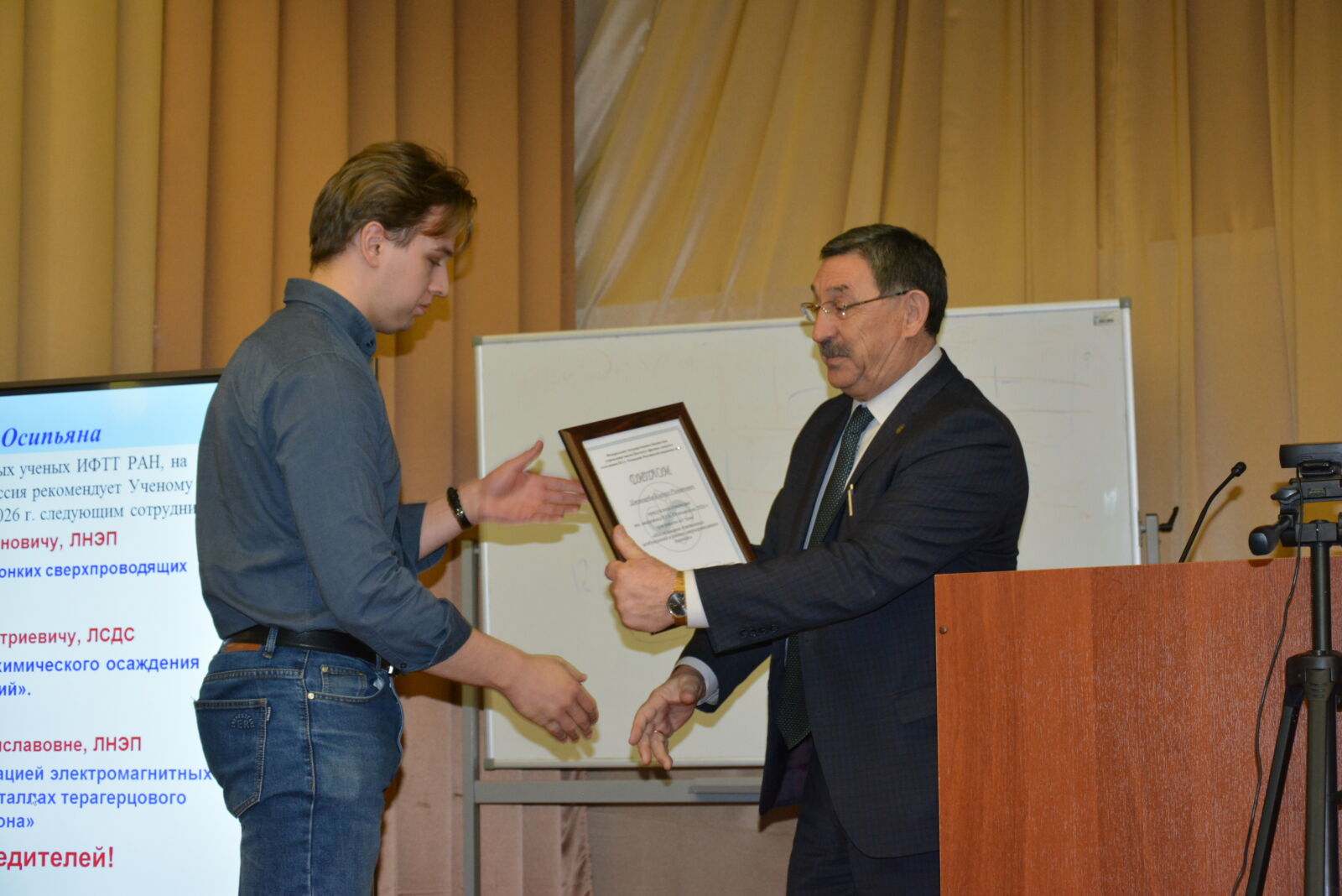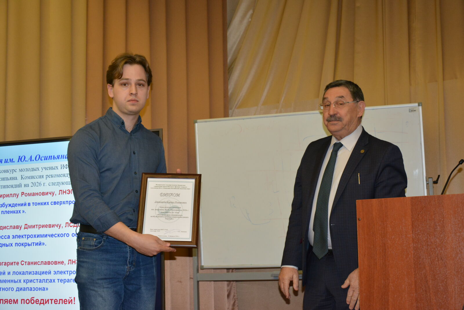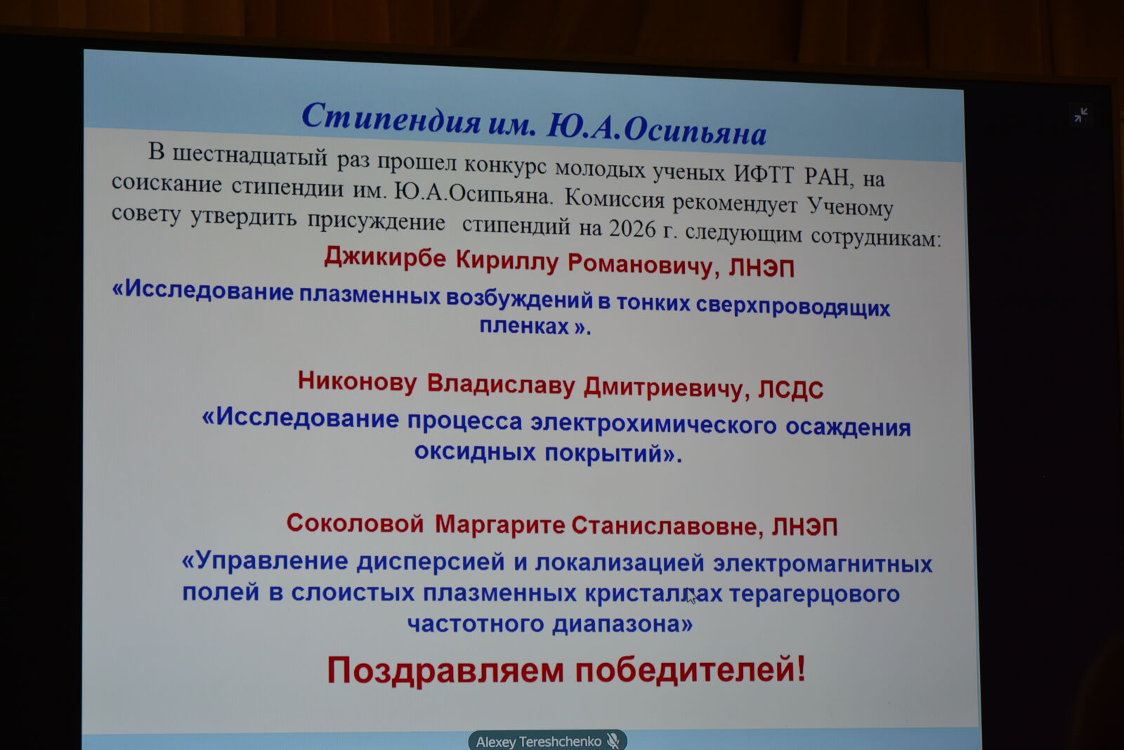 Открывая заседание, Александр Алексеевич отметил, что 15 февраля 2026 года исполнилось 63 года ИФТТ РАН и 95 лет со дня рождения одного из организаторов Института – академика Юрия Андреевича Осипьяна. В 2025 году в ИФТТ РАН был открыт мемориальный кабинет академика Ю.А. Осипьяна. В преддверии 15-го февраля по традиции состоялся конкурс научных работ молодых ученых на соискание стипендии им. Ю.А. Осипьяна. После утверждения итогов конкурса Ученым советом победителям в торжественной обстановке были вручены Дипломы стипендиатов. Победителями конкурса 2026 года стали: Джикирба Кирилл Романович, представивший работу «Исследование плазменных возбуждений в тонких сверхпроводящих пленках»; Никонов Владислав Дмитриевич – за работу «Исследование процесса электрохимического осаждения оксидных покрытий» и Соколова Маргарита Станиславовна – за работу «Управление дисперсией и локализацией электромагнитных полей в слоистых плазменных кристаллах терагерцового частотного диапазона».