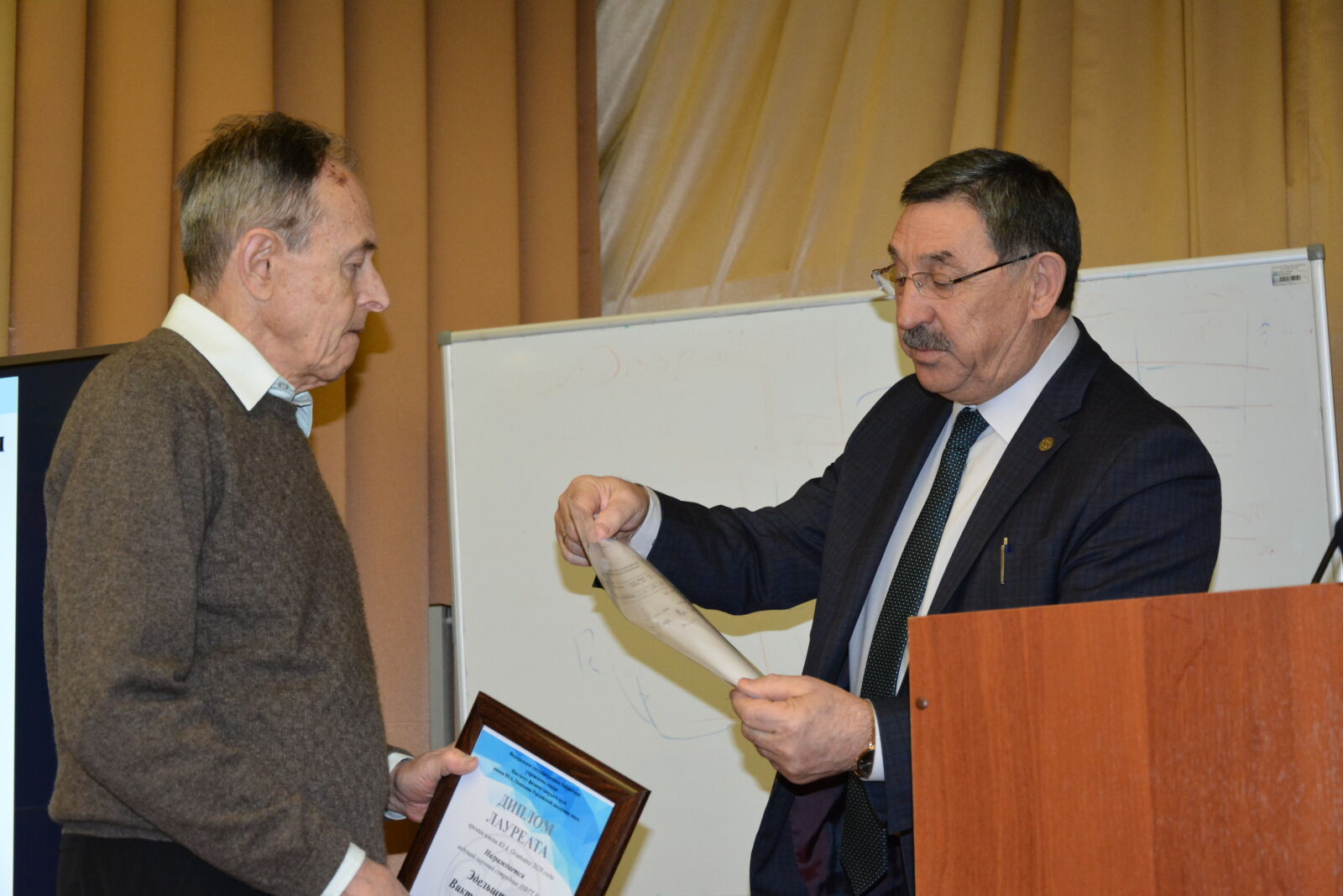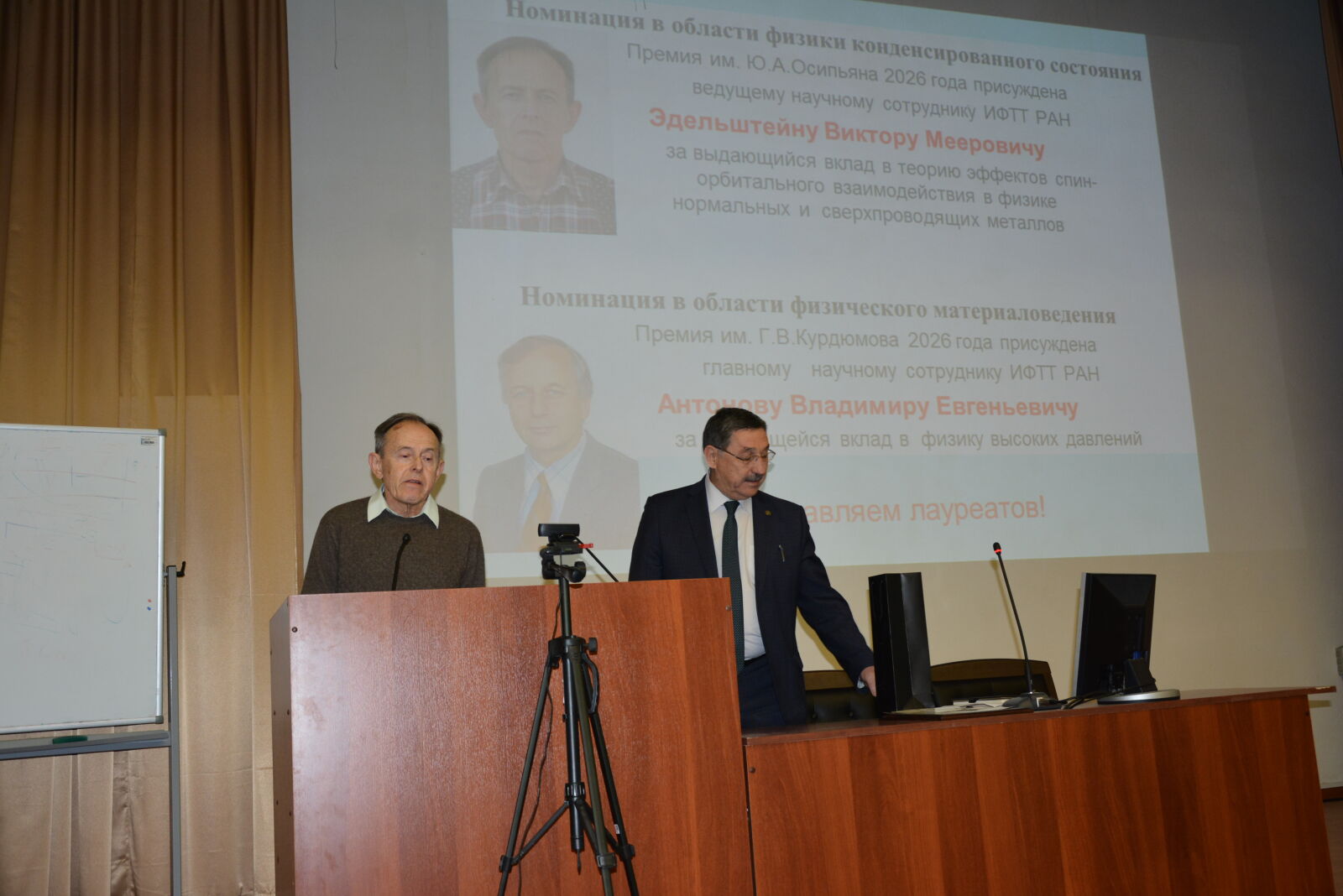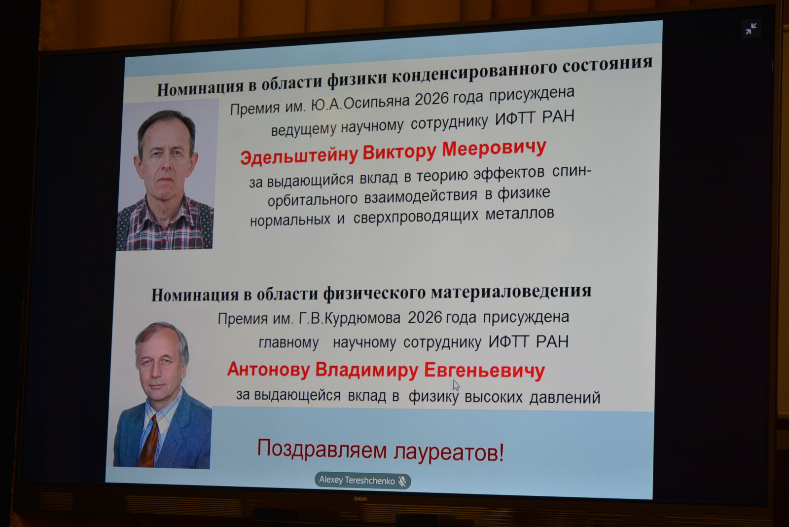 В ходе ежегодного отчетного доклада А.А. Левченко вручил сотрудникам Института премии имени Ю.А. Осипьяна и премии имени Г.В. Курдюмова. Премия имени Ю.А. Осипьяна присуждается решением Ученого совета ИФТТ РАН за научные достижения в области физики конденсированного состояния, а премия имени Г.В. Курдюмова – за научные достижения в области физического материаловедения. Лауреатом премии имени Ю.А. Осипьяна в 2026 году стал ведущий научный сотрудник к.ф.-м.н. В.М. Эдельштейн за выдающийся вклад в теорию эффектов спин-орбитального взаимодействия в физике нормальных и сверхпроводящих металлов.
