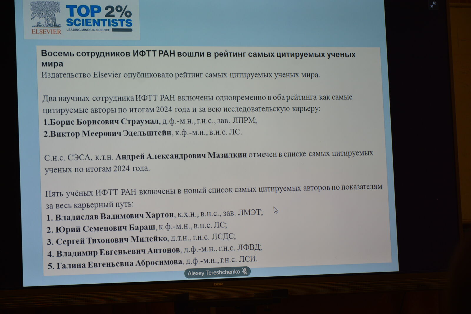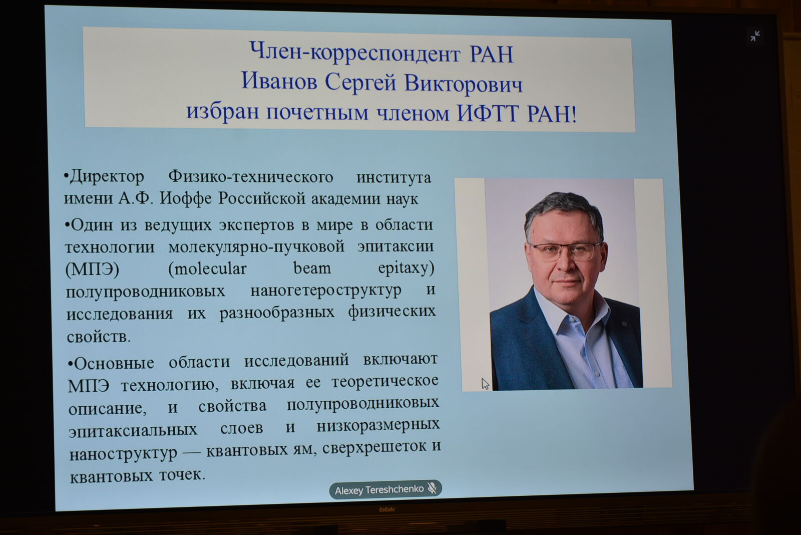 Следуя традициям, Александр Алексеевич представил собравшимся Почетного члена ИФТТ РАН, избранного Ученым советом Института в 2026 году. Им стал директор Физико-технического института имени А.Ф. Иоффе РАН, член-корреспондент РАН С.В. Иванов – один из ведущих экспертов в области технологии молекулярно-пучковой эпитаксии полупроводниковых наногетероструктур и исследования их разнообразных физических свойств.