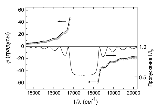 Спектры пропускания и фазовой задержки (вращения плоскости поляризации света) холестерического фотонного кристалла. Экспериментальный и рассчитанный спектры φ показаны символами и сплошной кривой.