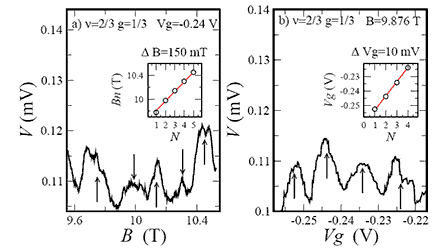 Принцип работы интерферометра в режиме дробного квантового эффекта Холла показан на рис.1. В верхней части рисунка показана часть реального образца, визуализированная с помощью сканирующего электронного микроскопа. Интерферометр работает при температуре 30 мК в относительно сильных магнитных полях. На рис.2 приведены примеры интерференционных картин, полученных для целочисленных факторов заполнения при сканировании магнитного поля и напряжения на затворе.