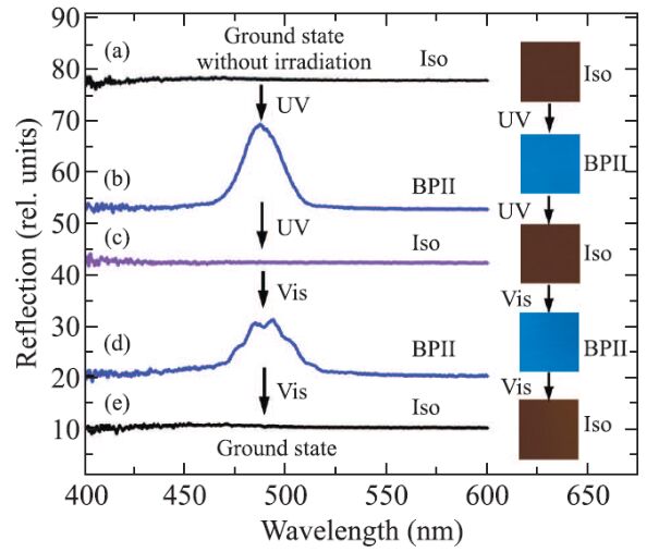 Использован жидкокристаллический материал, содержащий фоточувствительное вещество, молекулы которого изменяют форму при освещении. Обнаружено, что освещение материала в изотропной фазе светом ультрафиолетового диапазона приводит к образованию упорядоченной структуры скирмионов с появлением характерного рефлекса в спектре отражения (рис. 1). Кубическая структура сохраняется при выключении освещения. Обнаружено, что у фотоиндуцированной кубической структуры конечное окно стабильности по интенсивности облучения. Длительное освещение ультрафиолетовым светом или облучение видимым светом приводит к обратному переходу в изотропную фазу.