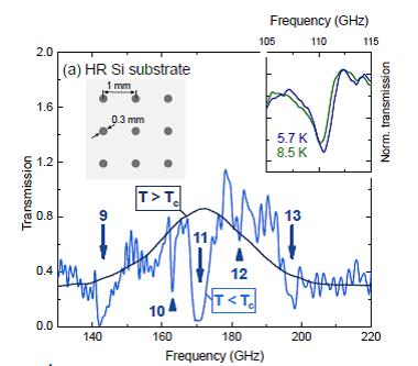 В настоящей работе в тонких пленках NbN впервые обнаружены двумерные плазменные волны в системе сверхпроводящих электронов (Рис. 1) и измерена их дисперсия (Рис. 2). Мы использовали очень тонкие пленки NbN, в которых концентрация сверхпроводящих электронов была значительно уменьшена по сравнению с полной электронной плотностью. В этих условиях нами были обнаружены особенности резонансного пропускания ТГц излучения, которые зависели от размера электронной системы. Установлено, что эти резонансы исчезали при температурах выше критической (Тс). Кроме того, показано, что по мере увеличения температуры вплоть до Тс наблюдался сдвиг резонансной частоты в сторону меньших частот (за счет уменьшения плотности сверхпроводящих электронов), а также наблюдалось значительное уширение резонансных особенностей. Измерена дисперсия плазменных возбуждений и показано, что плазменная частота линейно зависит от волнового вектора.
