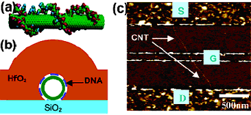 1. Молекулы ДНК обволакивают нанотрубку (а). Разрез канала транзистора (b). Вид