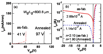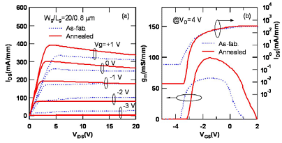 Рис. 2. (а) напряжение пробоя и (b) ВАХ затвор-сток HEMT до и после отжига.