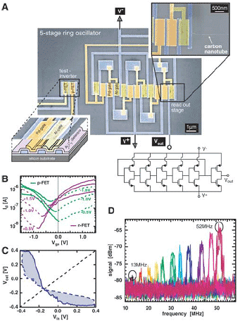 Специалисты IBM T.J.Watson Research Center изготовили логические схемы всего на одной одностенной углеродной нанотрубке в полупроводниковом состоянии [1] (рис. 1). Был изготовлен инвертор, который является главным элементом в современной архитектуре логических схем. Был также изготовлен кольцевой генератор, состоящий из 5 инверторов. Кольцевой генератор не используется в логике, но служит для измерения времени задержки сигнала в инверторе. Одна и та же длинная (18мкм) нанотрубка служит каналом во всех полевых транзисторах (FET) в схеме (рис. 1А).