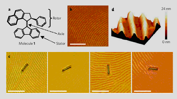 Рис.1. a) структура молекулы-мотора; b) текстура поверхности жидкокристаллической пленки, содержащей большое количество таких молекул; c) вращение стеклянной палочки наномоторами (промежуток времени между снимками 15с, длина масштабной линейки 50мкм); d) рельеф поверхности пленки.