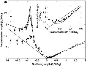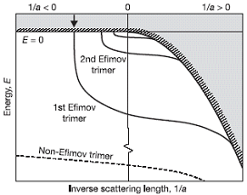 И вот эффект Ефимова наконец-таки обнаружен на эксперименте в совместной работе сотрудников Univ. Innsbruck, Inst. Quantenoptik und Quanteninformation (Австрия) и Univ. Chicago (США) [2]. Но не в ядре, а в системе из трех атомов цезия в магнитной ловушке. Сила взаимодействия этих атомов характеризуется длиной рассеяния a. В двухчастичной системе связанные (молекулярные) состояния существуют при a > 0 и отсутствуют при a < 0. Именно при a < 0 ожидается появление состояний Ефимова (см. рис.1). Авторы [2] меняли величину a, используя магнитное поле. Хотя на эксперименте измеряли не сам энергетический спектр, а так называемую длину в трехчастичной рекомбинации, полученные результаты (а именно – наблюдение трехчастичного резонанса) однозначно свидетельствуют о существовании, по крайней мере, одного связанного состояния Ефимова при a = -850aB, где aB » 0.053нм – боровский радиус. Пусть эксперимент пока не во всем согласуется с теорией, но все же: подобно тому, как резонансы Фешбаха дали ключ к контролю квантово-механических взаимодействий на двухчастичном уровне, существование эффекта Ефимова в атомной физике открывает новые возможности в исследовании удивительного мира многочастичных квантовых явлений.