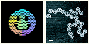 Рис. “Смайлики” из ДНК. Изображение получено с помощью атомной силовой микроскопии. Длина масштабной линейки 100нм.