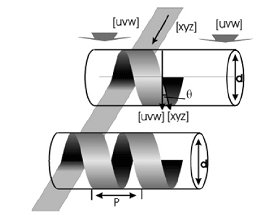 Проф. Д.Грютцмахеру из Института им. Пауля Шеррера в Швей царии понравились спиральки. Швейцарцы давно научились делать хорошие, точные и надёжные пружинки, потому и часы у них – лучшие в мире. Вот и последние публикации группы Д.Грютцмахера посвящены пружинкам [4,5]. Для изготовления микропружинок по Принц-технологии используется анизотропия упругих свойств полупроводников со структурой алмаза или цинковой обманки. Напряженные плёнки, выращенные на подложке с ориентацией (100), сворачиваются в направлении <100>, для которого модуль Юнга минимален. Поэтому, если продолговатая меза-заготовка для скрутки сориентирована вдоль <100>, то получится трубка-свиток. Если же отклониться от этого направления на определённый угол (q), то получится спираль – пружинка, шаг которой (p) определяется углом q : p=pdtgq (см. рис.1). Схема процесса изготовления пружины и результат приведены на рис. 2.и 3.