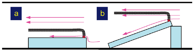 Рис.1. Возможные схемы роста ОСНТ. Катализатор нанесен на правый край пластинки. а) сначала нано-трубка растет вверх, затем “подхватывается” стабильным ламинарным потоком, и растет вдоль подложки; b) при небольшом подъеме края с катализатором вырастают более длинные нанотрубки.
