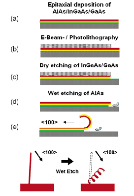 Сибирские «самокрутки» родились в 1995 году в общем-то достаточно случайно. В.Принц сотоварищи вздумали создать туннельно-тонкий промежуток в двухслойной напряжённой полупроводниковой структуре, сперва освободив её от подложки, а затем пропустив по ней трещину. Встроенные механические напряжения должны были слегка изогнуть края трещины и развести их на маленькое расстояние, в принципе вплоть до нескольких ангстрем. Подбирая толщины и рассогласование параметров решётки в двухслойной псевдоморфной гетероструктуре, можно было бы прецизионно контролировать туннельный зазор. Идея исключительно простая и здравая, но исполнение подвело. Канал, вытравленный под бислойной InGaAs/GaAs структурой, оказался слишком широким и вместо того, чтобы слегка разойтись, берега трещины свернулись в трубочки. Пусть пока и микронных диаметров. Чудо свершилось, потому что исконно плоская (планарная) микроэлектроника выпрыгнула в третье измерение. И выпрыгнула упруго-нестандартным способом. Принц-технология сделала первый вздох. Естественно возник вопрос: «А где предел? Можно ли скрутить плёнки толщиной в несколько атомов?» Большие учёные сказали Принцу, что прыгать в ширину бессмысленно - отделить от подложки пленки ангстремных толщин невозможно, к тому же они окислятся. Принц не поддался на запугивание и через пару-тройку лет наделал трубок и спиралей с диаметром от микро- до нанометров из плёнок толщиной от сотен до нескольких ангстрем [2]. На одной из международных конференций по физике полупроводников тогда ещё не нобелевский Герберт Крёмер был просто очарован сибирскими нанозавитками и предсказал им большое будущее. И он не ошибся, так как в настоящее время более десятка групп во всём мире двигают технологию Принца по самым разным направлениям.