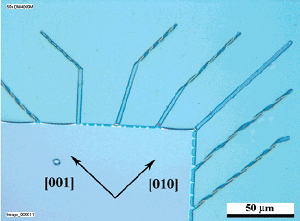 На рис. 2 показано, как происходит рост нанотрубок через щель в подложке и вертикальные препятствия. На пластинке со щелью шириной 100мкм был специально сделан барьер высотой 20мкм. Затем на край пластинки, примерно на расстоянии 2мм от щели, была нанесена тонкая пленка катализатора. На рис.2а,b,c видно, как углеродные нанотрубки растут от одного конца до другого и «карабкаются» на препятствие. На рис.2d показана схема роста.