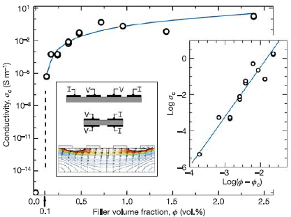 В совместной работе сотрудников Northwestern Univ. и Purdue Univ. (США) [1] предложен общий подход к синтезу композитов полимер/графен. Он основан на химическом окислении графита, его обработке ультразвуком (при которой происходит расщепление на отдельные окисленные графеновые слои), растворении совместно с полимером в растворителе и последующем восстановлении с целью удаления кислородных групп. В результате образуется твердый композит, характеристики которого почти такие же, как у композитов на основе углеродных нанотрубок, а себестоимость – гораздо ниже (цена графита – несколько долларов за килограмм). Порог перколяции составляет всего ~ 0.1 об. %, а при концентрации графена φ ~ 1 об. % проводимость достигает ~ 0.1С/м (что уже достаточно для многих приложений) и быстро увеличивается с ростом φ (см. рис.2). Конечно, о замене кремниевых чипов на графеновые говорить пока рано, но уже сейчас обсуждается вопрос о применении графеновых композитов в солнечных батареях, в компонентах компьютеров (для диссипации избыточного тепла) [2,3] – словом, везде, где проводимость углеродных волокон недостаточно высока, а углеродные нанотрубки слишком дороги.