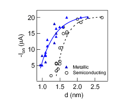Рис.1. Зависимость электрических свойств полупроводниковых и металлических УНТ от диаметра. Ion - ток через трубку при смещении 1В при комнатной температуре. Контакты из палладия или родия.