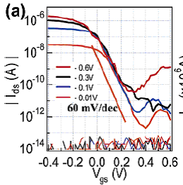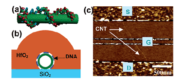 Для исследования транзисторных характеристик УНТ в качестве затвора используют окисленную пластину кремния, на которой трубка и лежит. Но чтобы лабораторная игрушка превратилась в прибор, трубку необходимо покрыть диэлектриком и приделать индивидуальный затвор сверху. Авторы [1] исследовали процесс нанесения ZrO2 и HfO2 на УНТ методом атомного наслаивания. Оказалось, что на чистую нанотрубку диэлектрик не желает высаживаться ни в какую, за исключением дефектных участков. Поэтому трубку приходится замуровывать в high-k диэлектрик, толщина которого составляет до 8нм, а крутизна ВАХ 70-90мВ/декаду. Причина невозможности осадить диэлектрик на чистую УНТ состоит в том, что при атомном наслаивании реагенты «зацепляются» за определённые функциональные группы (например, ОН) на поверхности подложки, что и обеспечивает протекание нужной химической реакции синтеза. На бездефектной нанотрубке такие зацепки отсутствуют, и синтез не идёт. Поэтому необходимо каким-либо образом создать эти функциональные группы на поверхности УНТ. Именно это сделали в Стэнфорде. И помогла учёным, как ни странно, дезоксирибонуклеиновая кислота (ДНК) марки dT40 [3]. Процедура функционализации УНТ оказалась совсем несложной, а простота – залог технологичности! После формирования сток-истоковых электродов пластину с будущим ПТ «окунали» в микромолярный водный раствор ДНК на полчаса при комнатной температуре, затем промывали в УЗ ванне 2 минуты и высушивали в азоте. На ДНК-функционализированной УНТ тонкий (2-3нм) слой HfO2 вырастает без всяких проблем и обладает пренебрежимо малыми токами утечки. Теперь на каждые 60мВ затворного напряжения ток в трубке увеличивается на порядок (рис. 2). Для использованной авторами геометрии этот параметр близок к теоретическому пределу.