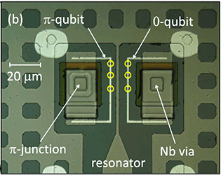 Figure 1. Qubit microphotography and its spectrum The superconducting flux qubit with integrated inverter of superconducting phase (a pi-junction developed in ISSP RAS [1]) was also fabricated. The pi-junction allows to reach qubit operation mode without external magnetic field needed in conventional case that provides increase of the qubit coherence time and makes multi-qubit architecture more compact.