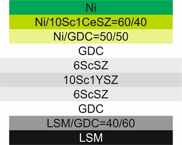 разработана конструкция многослойных электродов с градиентным составом и микроструктурой: трехслойный катод и четырехслойный анод;
