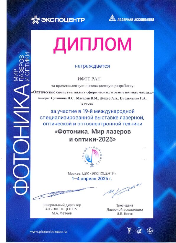 - Диплом ИФТТ РАН за представленную инновационную разработку «Оптические свойства полых сферических кремнезёмных частиц» , а также за участие в 19-ой Международной специализированной выставке лазерной, оптической и оптоэлектронной техники «Фотоника. Мир лазеров и оптики-2025» (01.04.2025г. – 04.04.2025г.)