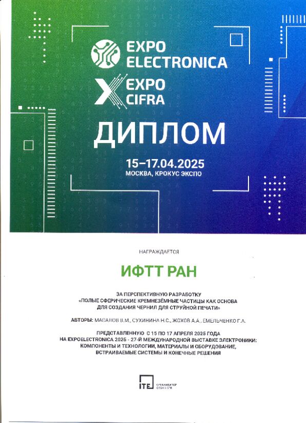 - Диплом ИФТТ РАН за перспективную разработку «Полые сферические кремнезёмные частицы как основа для создания чернил для струйной печати" на 27-ой Международной выставке электроники: компоненты и технологии, материалы и оборудование, встраиваемые системы и конечные решения «Экспоэлектроника-2025» (15.04.2025г. – 17.04.2025г.)
