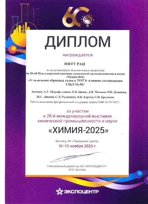 - Диплом ИФТТ РАН за представленную перспективную разработку «Утилизация сбросных газов в ТОТЭ: влияние соотношения CH4/CO2/H2O», за участие в 28-ой Международной выставке химической промышленности и науки «Химия-2025» (10.11.2025г. –13.11.2025г.)