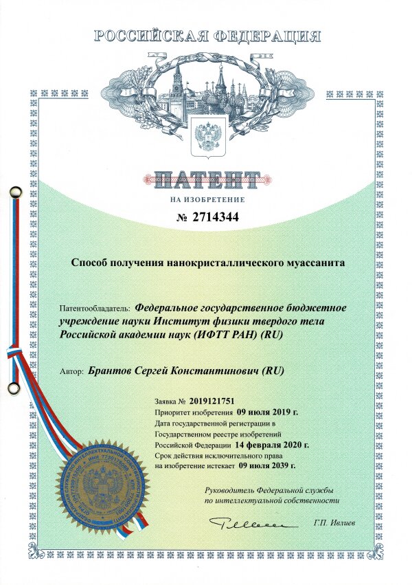Патент РФ на изобретение №2716447 «Тигель для выращивания кристаллов на затравку»Авторы: Колесников Н.Н., Борисенко Д.Н. Приоритет: 16.09.19 Зарегистрирован: 11.03.20 Способ получения нанокристаллического муассанита