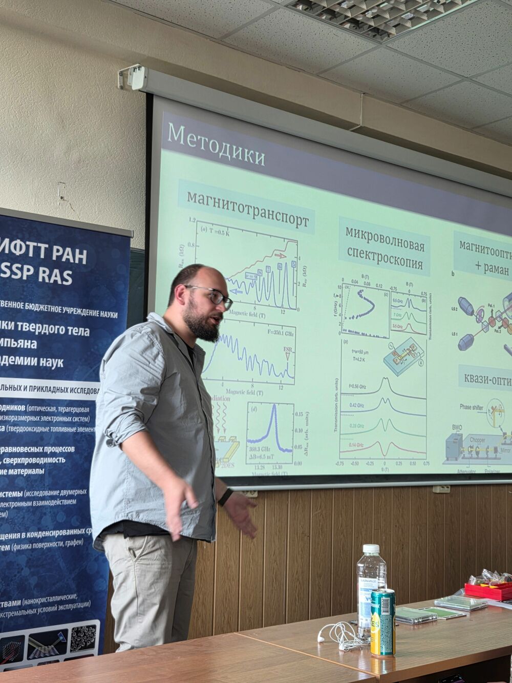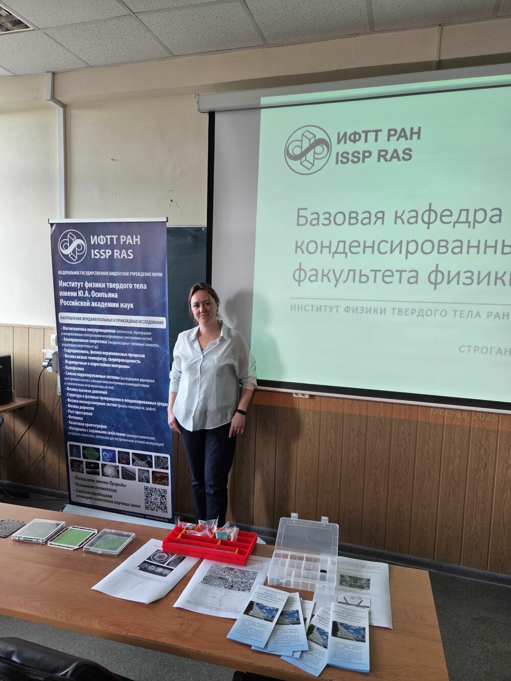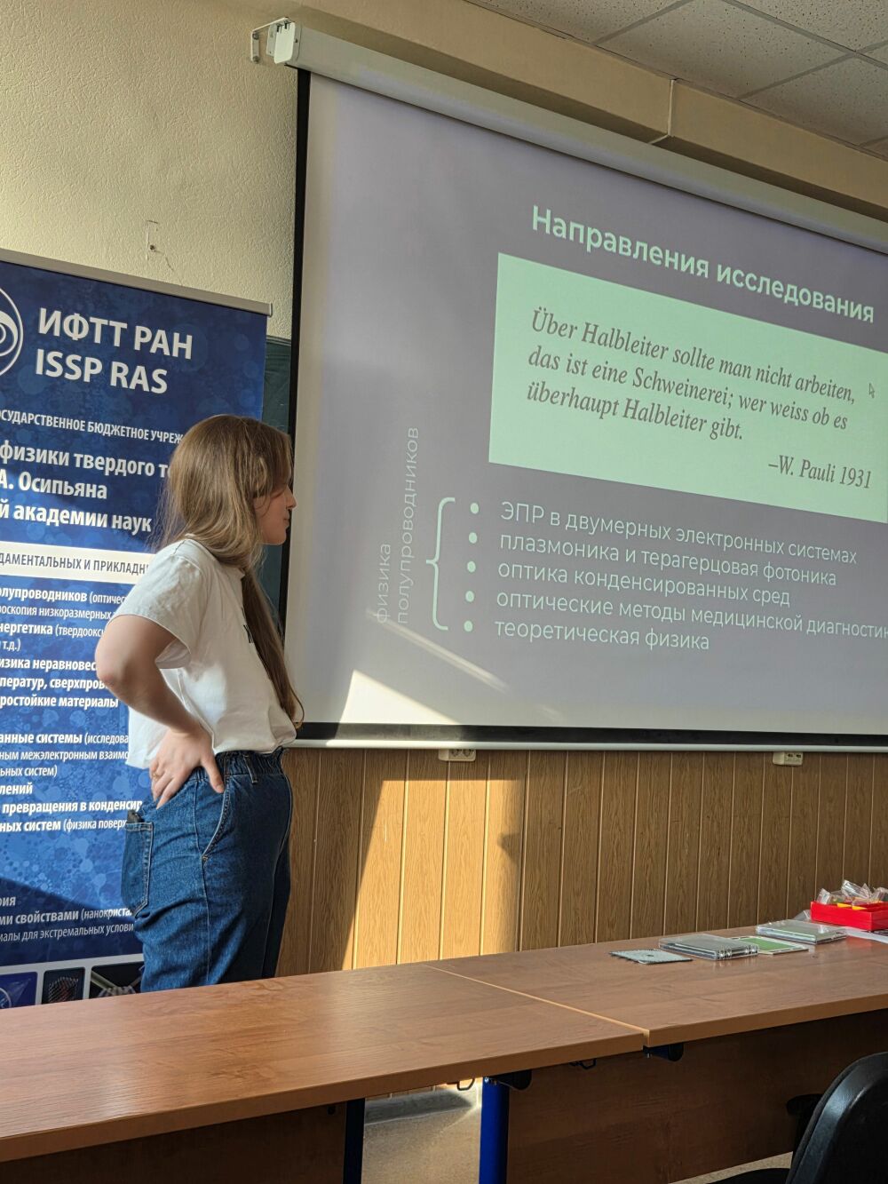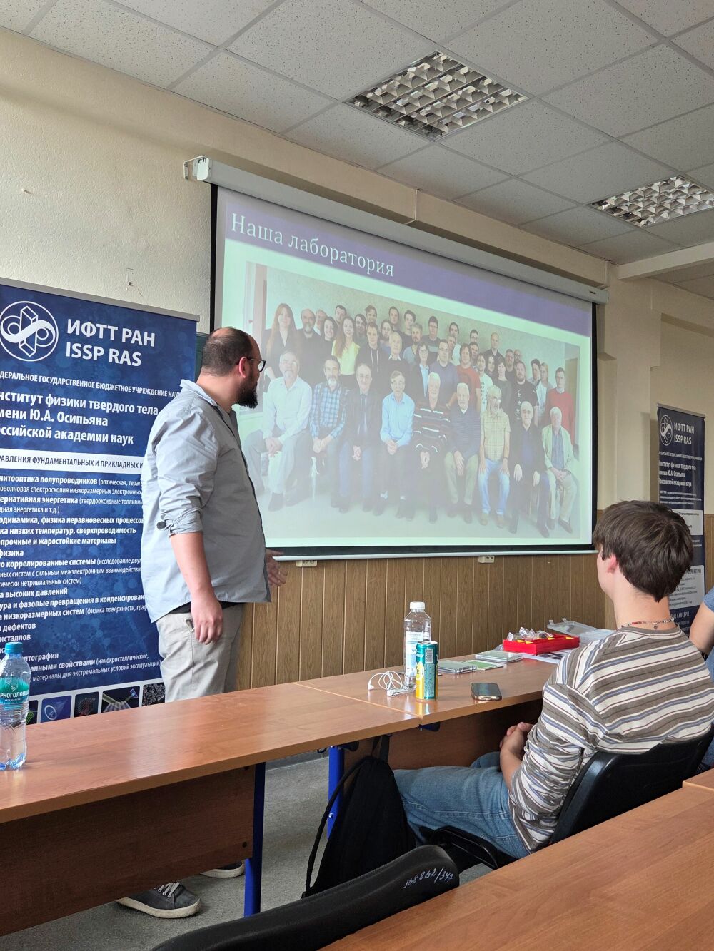 С.н.с. Лаборатории неравновесных электронных процессов ИФТТ РАН, доцент базовой кафедры ФКС НИУ ВШЭ к.ф.-м.н. Щепетильников А.В. сообщил о направлении научных работ лаборатории. Антон Вячеславович увлекательно рассказал о спинтронике и квантовом эффекте Холла, двумерных структурах и эксперименте Штерна–Герлаха. Своим впечатлением от учебы на кафедре и работе поделилась аспирант кафедры ФКС НИУ ВШЭ Андреева Софья Алексеевна, которая также является м.н.с. Лаборатории неравновесных электронных процессов ИФТТ. Софья рассказала о современном научном оборудовании, позволяющим проводить все этапы исследования в стенах ИФТТ РАН: от постановки задачи и создания образца до публикации статьи. Кроме этого, Софья подчеркнула широкий спектр научных задач, изучаемых в институте.