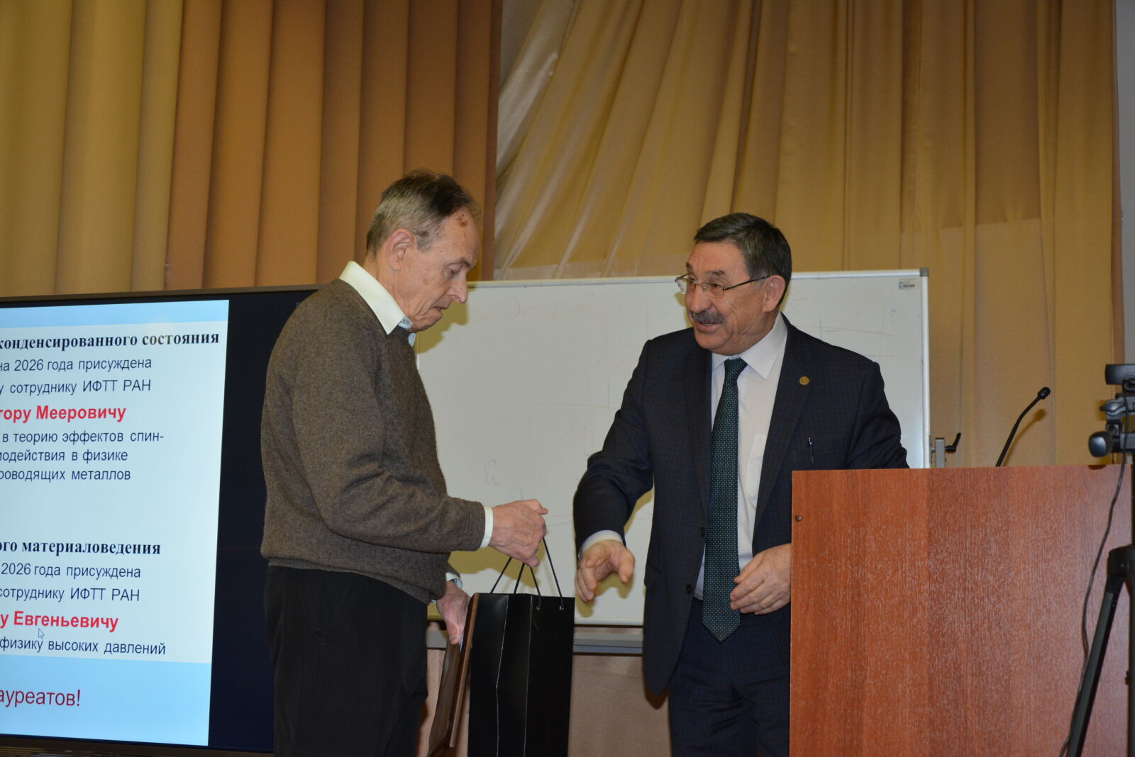 В ходе ежегодного отчетного доклада А.А. Левченко вручил сотрудникам Института премии имени Ю.А. Осипьяна и премии имени Г.В. Курдюмова. Премия имени Ю.А. Осипьяна присуждается решением Ученого совета ИФТТ РАН за научные достижения в области физики конденсированного состояния, а премия имени Г.В. Курдюмова – за научные достижения в области физического материаловедения. Лауреатом премии имени Ю.А. Осипьяна в 2026 году стал ведущий научный сотрудник к.ф.-м.н. В.М. Эдельштейн за выдающийся вклад в теорию эффектов спин-орбитального взаимодействия в физике нормальных и сверхпроводящих металлов.