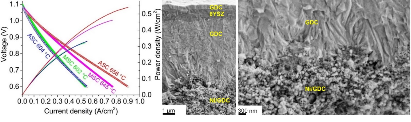 Представленная концепция МП-ТОТЭ была разработана и изготовлена впервые в мировой практике. Основная новизна связана с использованием метода осаждения слоев из сухого порошка, который позволил изготовить высокоактивный анод с температурами консолидации 950 – 1000°С достаточными для отсутствия значительного окисления стальных токосъемов и подложки, а также с адгезионной прочностью достаточной для осаждения электролитной мембраны магнетроном без промежуточных обжигов, что в конечном итоге позволило проводить единственный обжиг с разделенными газовыми пространствами анод-катод. Впервые в мировой практике промышленно-ориентированным методом был изготовлен анод для МП-ТОТЭ, внедренный в поры подложки почти на всю толщину, что обеспечивает невозможность его деламинации в процессе быстрых нагревов и охлаждений. Анализ спектров импеданса (Рис. 1) изготовленных МП-ТОТЭ и анод-поддерживаемых ТОТЭ (АП-ТОТЭ) на основе коммерческой подложки показал, что при температурах 600–650°С основной вклад в сопротивление в случае МП-ТОТЭ вносит катод, а в случае АП-ТОТЭ анодный и катодный вклад примерно равен, что продемонстрировало важность высокой активности анода при температурах 600–650°С.