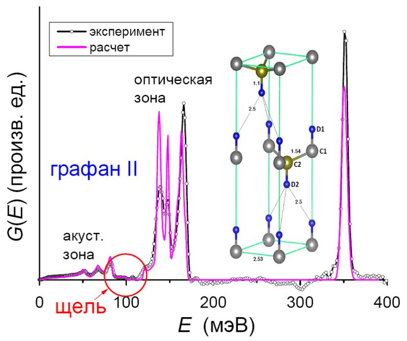 Многослойный графан (гидрид графита) – это новый кристаллический углеводород состава CH, впервые синтезированный в ИФТТ РАН [1] и представляющий собой одну из теоретически предсказанных ранее [2] фазу «графан II» 3D-графана, состоящую из гофрированных слоев 2D-графана в конформации «кресло», уложенных вдоль гексагональной оси в последовательности -ABAB-, пр. группа P63mc (Рис. 1). Кристаллическая структура графана была однозначно установлена в нынешней работе по наличию щели вблизи 100 мэВ в колебательном спектре G(E), изученном при T = 7 K методом неупругого рассеяния нейтронов (см. рисунок) на практически однофазном образце. Такой образец впервые удалось синтезировать при T = 870 K и давлении водорода 7.4 ГПа, предварительно активировав поверхность частиц графита мягким помолом в атмосфере водорода при давлении 1 МПа. Хорошая точность определения колебательного спектра подтверждена калориметрическими измерениями при температурах 120–673 K.