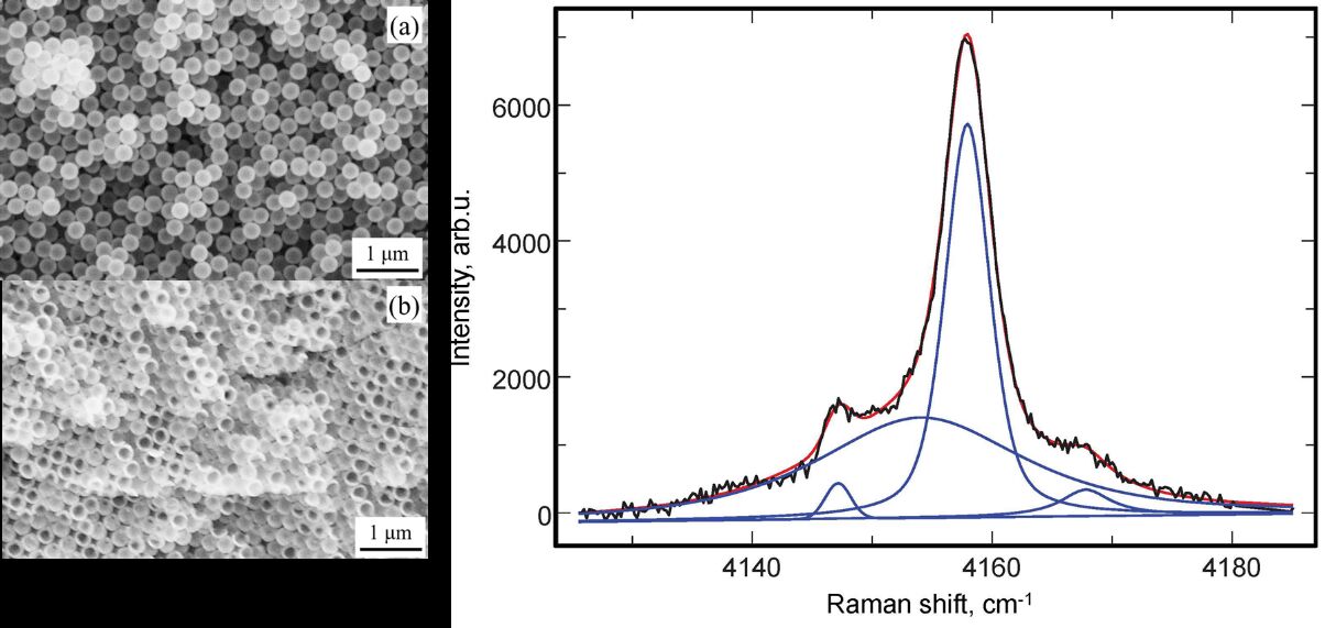 Полые сферы из силикатного стекла ранее предлагались в различных направлениях альтернативной энергетики как один из возможных материалов для хранения водорода и его изотопов. Однако, сферы с диаметром более 5 микрометров разрушаются при давлениях выше 1 кбар, что приводит к ограничению количества поглощенного ими водорода. В данной работе полые сферы SiO2 , имеющие в 17 раз меньший диаметр (289 нм), и толщину оболочки 25 нм, насыщались водородом при давлении P=75 кбар и температуре T = 413 К. Достигнутое значение молярного отношения H2/SiO2 = 0.94 является наивысшим содержанием водорода, когда-либо полученным в силикатах. Как показано на рисунке 1, высокое давление не деформировало и не разрушало эти сферы, что указывает на их высокую прочность. Согласно Рамановской спектроскопии (рис. 1), молекулы водорода образуют газ в полостях наносфер и твердый раствор в их оболочках. Величина плотности газа внутри полости ρ=0.016 г/см3, оцененная по этим спектрам, в 52 раза больше значения его плотности при атмосферном давлении. Таким образом, использование полых сфер диаметром 289 нм позволяет проводить насыщение водородом при более высоких давлениях и таким образом достичь высоких концентраций водорода в их полости и оболочке.