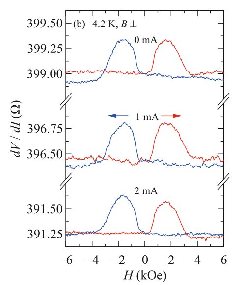 В данной работе мы экспериментально исследовали магнетосопротивление одиночного гетероперехода GeTe–Ni между топологическим полуметаллом α-GeTe и тонкой никелевой плёнкой при комнатных и гелиевых температурах. Мы продемонстрировали характерную спин-вентильную характеристику в сопротивлении гетероперехода при комнатной температуре и при температуре жидкого гелия (Рис. 1). Из продемонстрированной анизотропии магнетосопротивления, наблюдения нами аналогичного поведения для гетероперехода на основе дираковского полуметалла Cd3As2–Ni и полного отсутствия спин-вентильных эффектов для референсного гетероперехода GeTe–Au, мы можем уверенно связать обнаруженный спин-вентильный эффект с спин-зависимым рассеянием между спиновыми текстурами в топологическом поверхностном состоянии и ферромагнитным никелевым электродом. С точки зрения фундаментальных исследований мы продемонстрировали влияние топологических спиновых текстур на транспорт носителей заряда в гетероструктурах, с точки зрения возможных применений — эффективную конверсию спин-заряд уже при комнатной температуре.