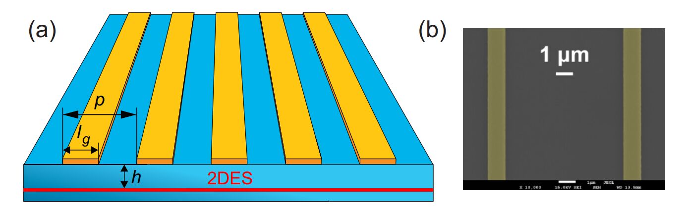 Проведено комплексное исследование спектра и релаксации плазменных возбуждений в плазмонном кристалле, изготовленном на основе двумерной электронной системы в полупроводниковой гетероструктуреAlGaAs/GaAs (Рис. 1). Ключевой особенностью эксперимента было использование терагерцовой спектроскопии во временной области для прямого наблюдения за эволюцией фундаментальной плазмонной моды при планомерном изменении ширины металлических полос затвора (коэффициента заполнения) при фиксированных периодах решётки 8 и 12 мкм. Для объяснения наблюдаемых явлений авторы разработали новый аналитический подход, основанный на решении уравнений Максвелла для пространственных гармоник, который оказался существенно точнее широко используемой феноменологической модели Кронига-Пенни. Теоретический анализ подтвердил, что плазмонные моды в таком кристалле имеют природу делокализованнойсверхрешетки и представляют собой гибридизацию множества пространственных гармоник, а не простое чередование мод в экранированных и неэкранированных областях. Другим важнейшим результатом работы стало выявление механизмов затухания плазменных колебаний. Было обнаружено, что ширина линии резонанса не является постоянной: при малых коэффициентах заполнения она определяется классическим одночастичным рассеянием (столкновениями с примесями и фононами), что коррелирует с измеренной транспортной подвижностью электронов. Однако с увеличением ширины затвора происходит резкое уширение линии, вызванное эффектами радиационного затухания. Это свидетельствует о том, что металлическая затворная решетка действует как эффективная антенна, связывающая плазмоны с внешним электромагнитным полем. Полученные результаты углубляют понимание физики плазмонных кристаллов и создают научную основу для инженерии новых терагерцовых устройств, таких как детекторы, генераторы и фазовращатели.