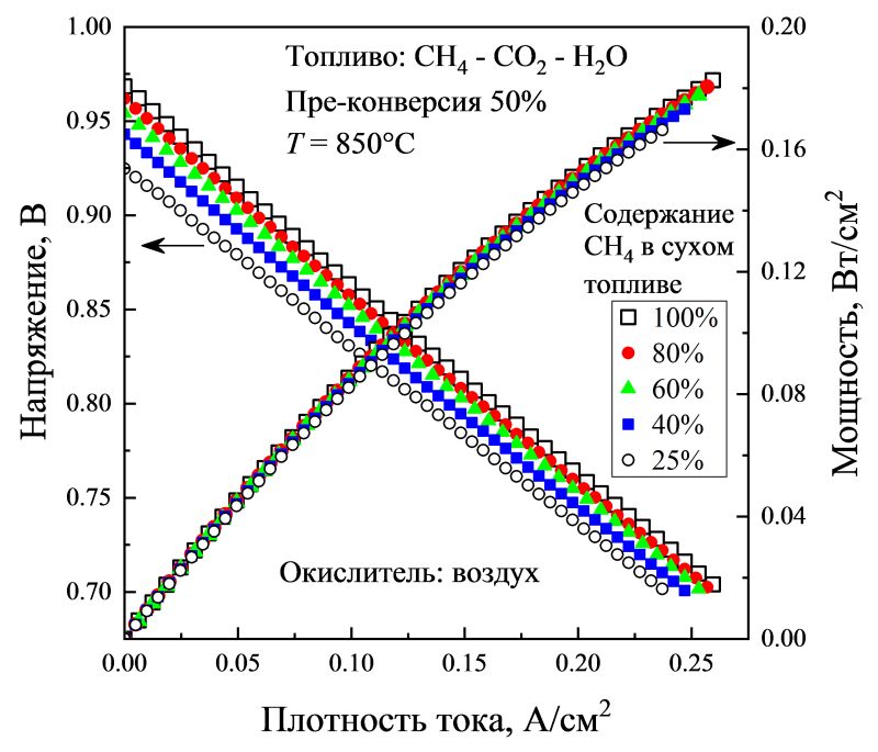Исследование направлено на решение проблемы утилизации низкокалорийных сбросных газов угольных шахт и полигонов твердых бытовых отходов. Основными компонентами свалочного и шахтного газов являются CH4, CO2 и N2. Низкая концентрация метана в таких газах затрудняет их утилизацию с использованием газопоршневых и газотурбинных установок. Технологии на основе твердооксидных топливных элементов (ТОТЭ) характеризуются рекордными КПД (до 65%), возможностью использовать различные виды топлива, экологической безопасностью, большим межсервисным интервалом и легкостью масштабирования. Поэтому использование сбросных газов в ТОТЭ для производства электрической и тепловой энергии существенно снизит нагрузку на окружающую среду. Эффективность и ограничения ТОТЭ, работающих на модельных топливных газах, содержащих 25–100 % метана, с внешним предварительным риформингом и без него, были оценены с использованием электрохимических испытаний и моделирования. Экспериментальные результаты (Рис. 1) показали, что ТОТЭ разработанной нами конфигурации с элементами промышленного размера (10×10 см2) позволяют использовать в качестве топлива газовые смеси с относительно низкими концентрациями метана по-прежнему обеспечивая достаточно высокую эффективность преобразования энергии. Это подтверждается результатами моделирования, показывающими, что даже при значительном разбавлении метана (до 10%) сохраняется возможность стабильной работы ТОТЭ с приемлемыми значениями мощности; КПД при этом падает незначительно (с 59% до 44%).