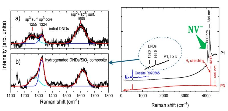Одиночные детонационные наноалмазы (ДНА) с азотно-вакансионными центрами NV привлекают интерес в качестве излучателей одиночных фотонов. В данной работе предложен способ преодоления двух основных проблем ДНА: склонности к агломерации и наличия оболочки из графитоподобного углерода. После сжатия при 75 кбар и 250 °C исходный аэрогель SiO2, содержащий отдельные наночастицы ДНА, необратимо превращается в плотный и химически инертный материал, препятствующий их агломерации. Последующее его насыщение водородом при P=75 кбар и T=600 °C удаляет часть оболочки ДНА (рис. 1, левая панель) и, таким образом, активизирует люминесценцию отрицательно заряженных NV– без использования низких температур (рис. 1, правая панель).