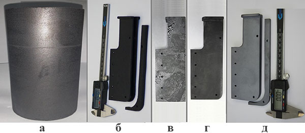 Рис. 1. Углеродная микропористая заготовка до (а) и после (б) механической обработки; карбидокремниевая заготовка после силицирования (в) и финишной обработки (г). Готовое изделие с SiС защитным покрытием (д).