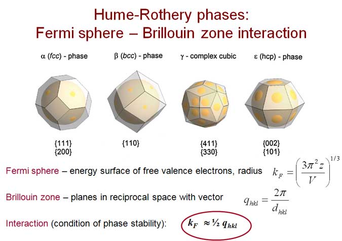 Within the nearly-free-electron model valence electrons occupy the states in momentum space inside the Fermi spheres with the Fermi radius kF =(3p2 z/V)1/3, where z is the number of valence electrons per atom and V is the atomic volume. In a metallic crystal electrons interact with a Brillouin plane corresponding to a reciprocal vector qhkl if it is close to 2kF . This condition, kF ≈ ½qhkl , leads to the opening of an energy gap and increasing in the density of electron states with reducing in the total electron energy. The energy gap is proportional to the square of the structure factor for a given plane. Thus, the EBS contribution is important for those planes that give strong diffraction peaks and which are located with their wave vectors near position of 2kF. The classical example of phases stabilized by the EBS term is the Cu-Zn alloy system. The constituent elements Cu and Zn are neighbors in the Periodic Table and therefore have minimal difference in atomic size and electronegativity. This implies that the main factor of the structure stabilization for intermediate phases is the electron concentration defined as an average number of valence electrons per atom [1,2]. The phase sequence in the Cu-Zn system is the following:
