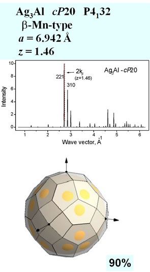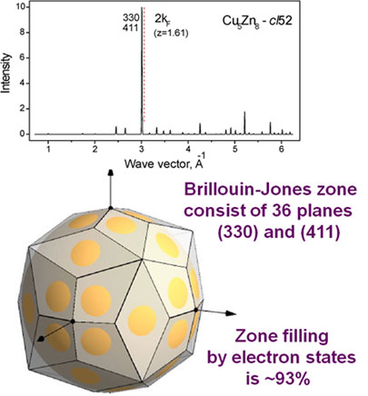 Similar phase sequences exist in many other binary systems containing a noble metal and a neighboring polyvalent element, called as Hume-Rothery phases. A complex gamma-brass phase of composition Cu5 Zn8 with 52 atoms in the unit cell (Pearson symbol cI52) is of special interest as an example when term EBS is gaining over electrostatic term. This structure is a 3x3x3 supercell of bcc with removing of 2 atoms from 54 and with slight rearrangement of the remaining 52 atoms to equalize interatomic distances. This gives an additional diffraction peak (411) with the same wave vector as for (330). The first explanation of the gamma-brass stability was done on the ground of a qualitative model of the Fermi sphere – Brillouin zone (FS-BZ) interaction [2]. The large Brillouin-Jones zone consists of 36 planes in close contact with the FS providing minimization of the crystal energy.